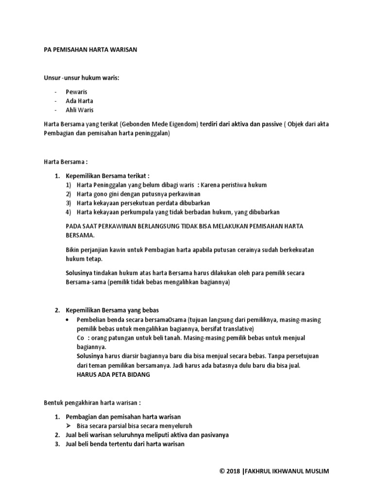 Membagi harta warisan diantara ahli waris yang berhak. Kandungan garis panduan terbahagi kepada empat (4) bahagian iaitu: Skw dengan penetapan pengadilan dibutuhkan terutama untuk kondisi ahli waris terdiri dari banyak orang yang selamat pagi pak arisman, mohon pencerahanya saya disuruh membeli sebahagian tanah. Pemuliharaan tapak/bangunan warisan jabatan warisan negara sangat komited dalam memastikan pemuliharaan tapak/bangunan warisan negara. Warisan adalah harta baik materi atau material yang di dipindahkan sebagai kepemilikan diberikan kepada ahli waris dari pewaris yang sudah meninggal.